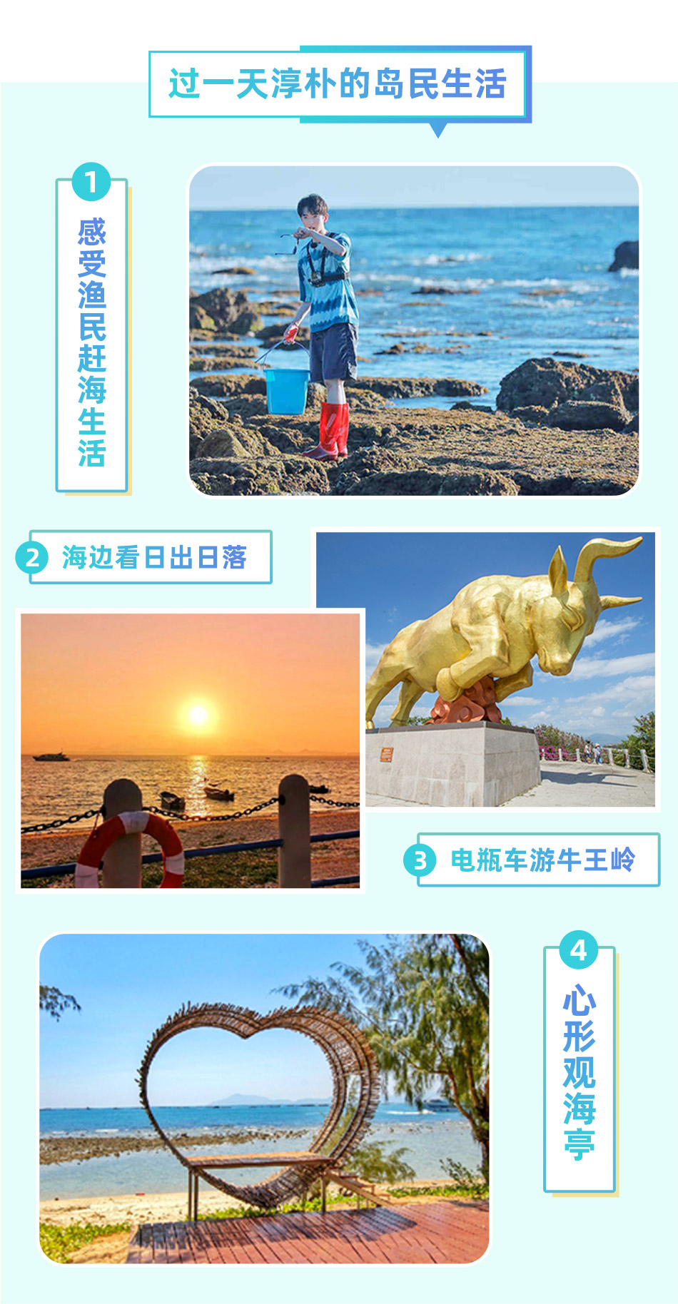 1.西岛电瓶车(牛王岛+游渔村)+海上乐园+享受岛民生活